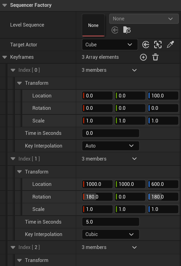 for storing information about a single keyframe. Later, we're going to use an array of this type to add keyframes to a transform track of a dynamically created level sequence.