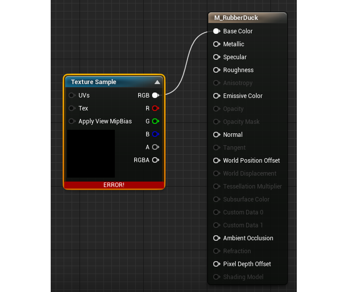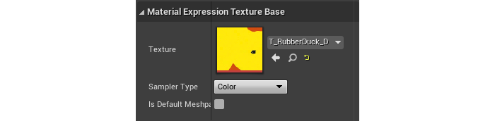While the newly added Texture Sample node is selected, in the left panel under Material Expression Texture Base assign the TRubberDuckD texture.