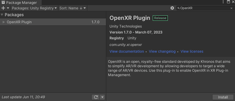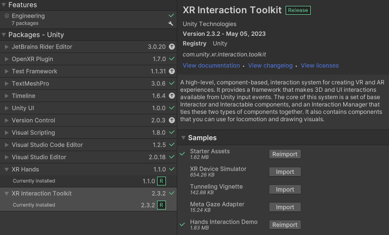 Repeat the same steps to install the other two plugins: XR Interaction Toolkit