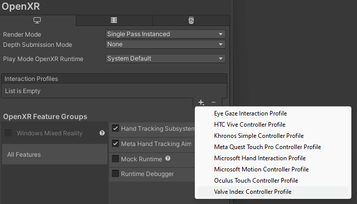 by ticking the respective checkboxes in OpenXR Feature Groups