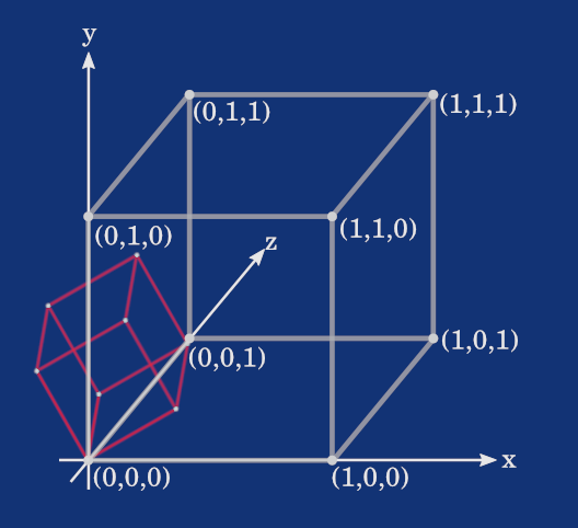 Take the following cube, for example. It’s defined by 8 vertices, and in this case, one of them lies at the origin.